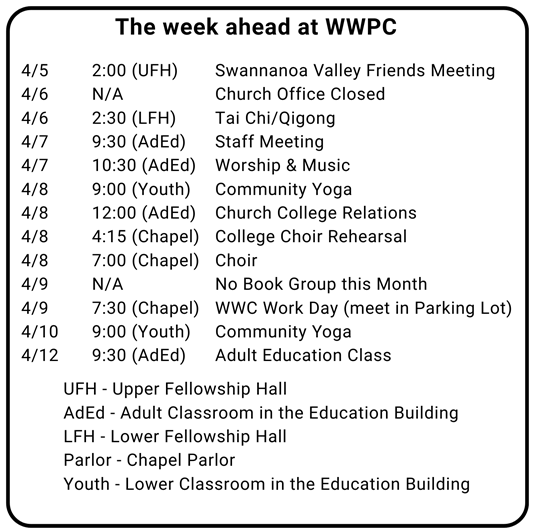 WWC WORK DAY The College invites church members and friends to participate in the annual WWC Workday on Thursday April 9, 2026 for work on beautifying the campus, outdoor clean-ups, as well as indoor less stressful work. Church volunteers meet at the church parking lot at 7:30 AM April 9; we will walk from the church to central campus at 7:45 to sign-in and choose a work crew. Volunteers will work with students and student leaders until noon when every volunteer is invited to a bar-b-cue served at the WWC Pavillion. From the Church-College Relations Mission Team