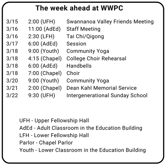 SUNDAY SCHOOL Both Adult and Youth classes are meeting during March for an Intergenerational Sunday School gathering. We are using curriculum from Illustrated Ministries that “invites us into the work of honest turning—facing hard truths, naming injustice, and trusting that transformation is possible even in the shadow of empire.” Class meets at 9:30 in the Fellowship Hall each Sunday. Come join us for a time of learning and reflection as we dive into the “The Work of Imagination” together!