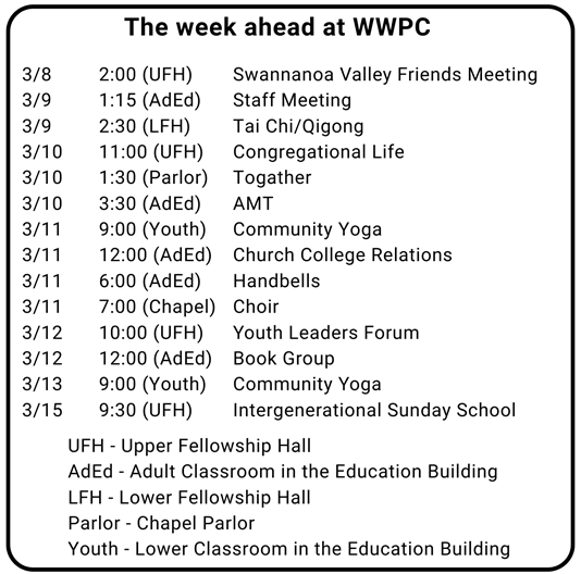 We celebrate: Our new pastor, Rev Jessica Rigel, as she prepares to move to our area⸰Warren Wilson Spring Break is March 7-March 15. Please be in prayer for our students as they travel.